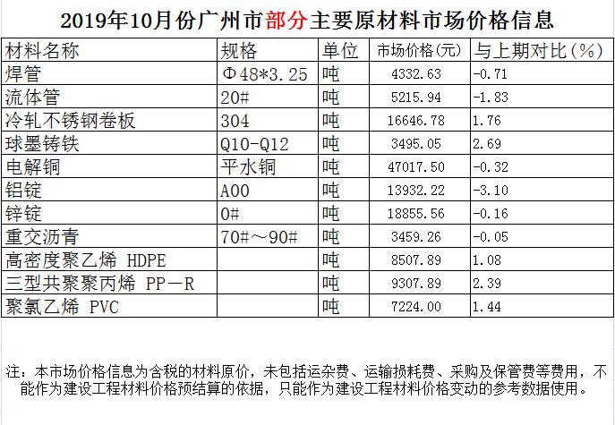 【主材价格】2019年10月份广州市部分主要原材料市场价格信息