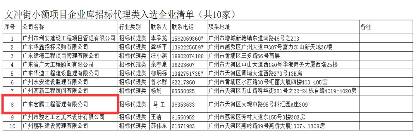 为加强广州市黄埔区文冲街道办事处小额工程建设项目发包的管理和监督,规范建设工程管理和服务工作,保证工程质量安全,打造公平有序建筑市场,促进廉政建设,根据《广州市小额建设工程交易管理试行办法》及“公平、公正、公开”的原则,决定建立广州市黄埔区文冲街道办事处小额工程建设项目招标代理企业库,有效期两年。按照诚信原则、就近原则、实际需求原则,择优原则,拟定企业库名单,经提交街道党政班子联席会议研究,现进行公示。